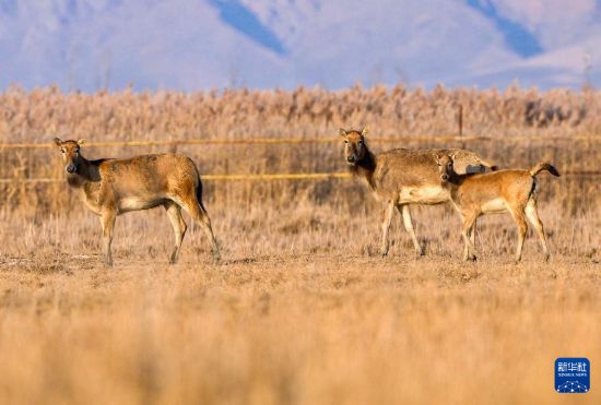 这是11月4日在宁夏青铜峡库区湿地自然保护区内拍摄的麋鹿和麋鹿幼崽(右)。 青铜峡库区湿地自然保护区总面积174.93平方公里,是宁夏最大的黄河滩涂类型湿地。