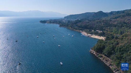 1月27日在云南省玉溪市拍摄的抚仙湖一景(无人机照片)。 冬日抚仙湖碧波荡漾,风光宜人,吸引不少游客前来游览。