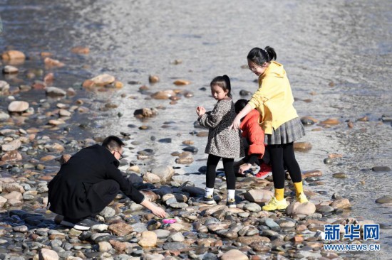2月18日,市民带着孩子在黄河兰州段河床上捡石头。