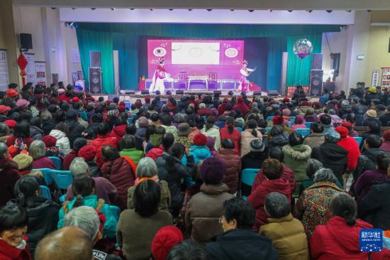 2月15日,大墅镇儒洪村村民们在文化礼堂观看传统戏曲表演。