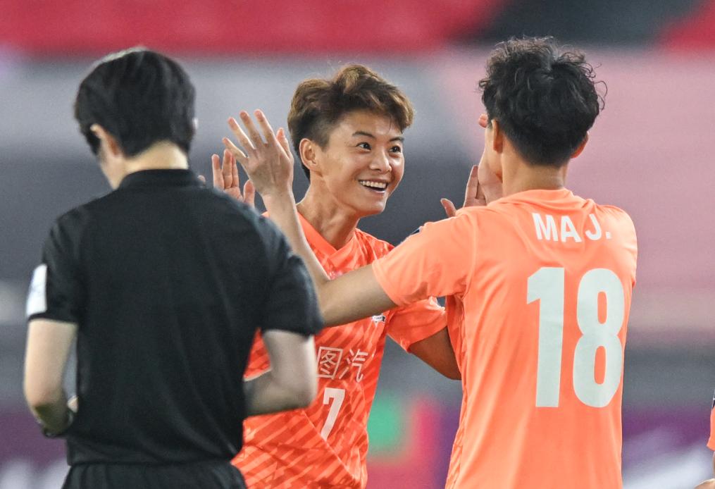 5月24日,武汉车谷江大队球员王霜(中)在点球大战中庆祝。新华社记者 杜子璇 摄
