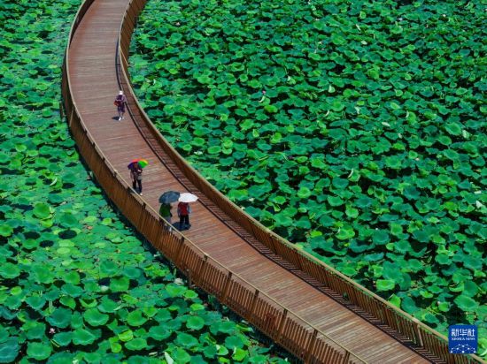 夏日时节,南京玄武湖公园内的荷叶渐密,赏荷栈道隐匿其中,宛如一条通往梦幻仙境的小径,吸引众多市民游客前来漫步休闲,临水赏荷。