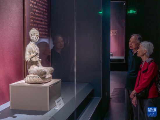 8月16日,观众在鄂尔多斯市博物院观赏建造于北齐的彩绘石雕菩萨像。