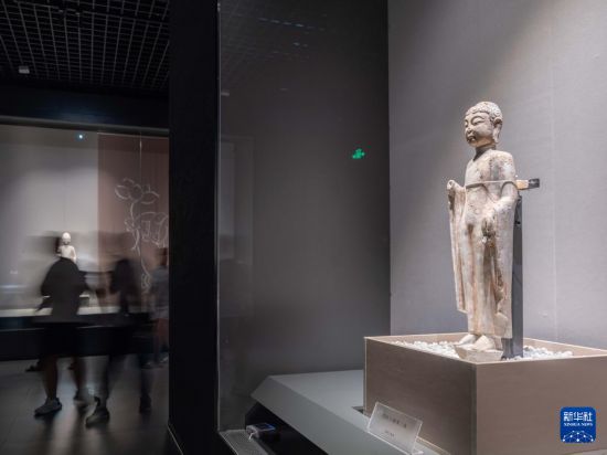 这是8月16日在鄂尔多斯市博物院拍摄的建造于北齐的彩绘石雕佛立像。