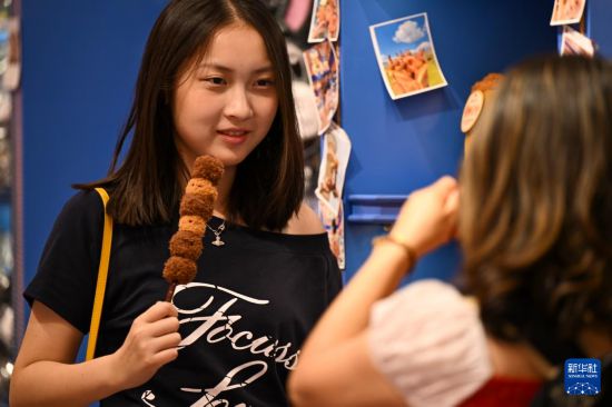 8月21日,在乌鲁木齐大巴扎步行街,游客手持文创产品拍照留影。