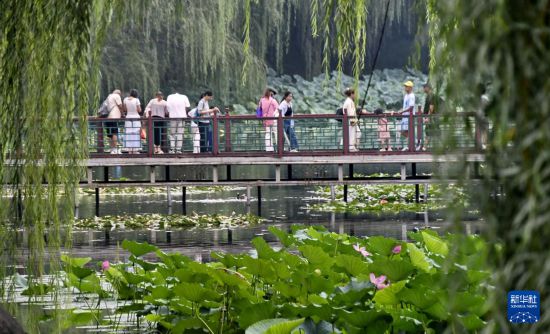 游人在圆明园遗址公园内的荷花种植观赏区赏荷(8月21日摄)。