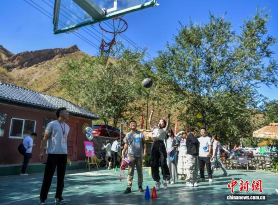 8月27日,新疆乌鲁木齐市石人子沟景区一处农家乐,青年男女配合默契,共同参与搭档投篮游戏。中新社记者 刘新 摄