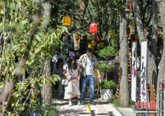 8月27日,新疆乌鲁木齐市石人子沟景区一处农家乐,青年男女用手机拍摄微笑合影,相互转发。中新社记者 刘新 摄