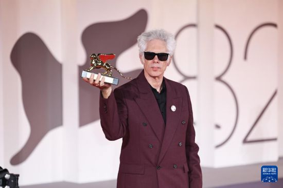 9月6日,在意大利威尼斯,最佳影片金狮奖《父母姐弟》的导演吉姆·雅穆施与奖杯合影。