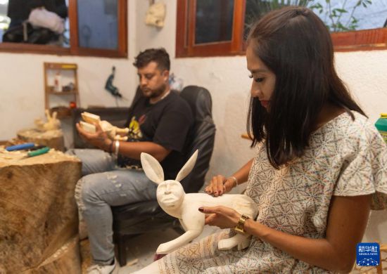 9月16日,在墨西哥瓦哈卡州圣安东尼奥阿拉索拉村一个彩色木雕工坊,手工艺人在打磨木材。