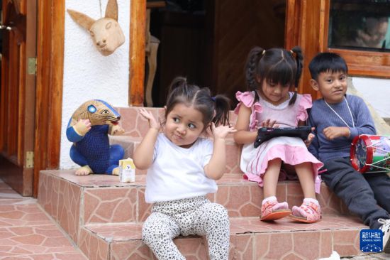 9月16日,在墨西哥瓦哈卡州圣安东尼奥阿拉索拉村一个彩色木雕工坊,小朋友们在木雕旁玩耍。