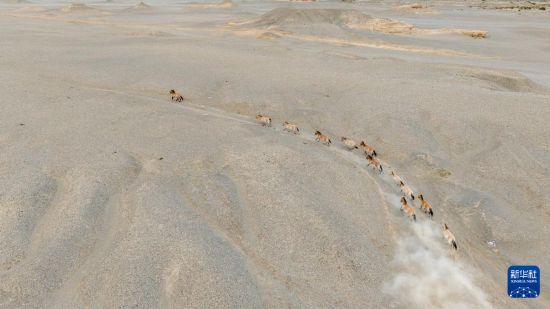 这是9月24日在甘肃敦煌西湖国家级自然保护区内拍摄的普氏野马(无人机照片)。新华社记者 郎兵兵 摄