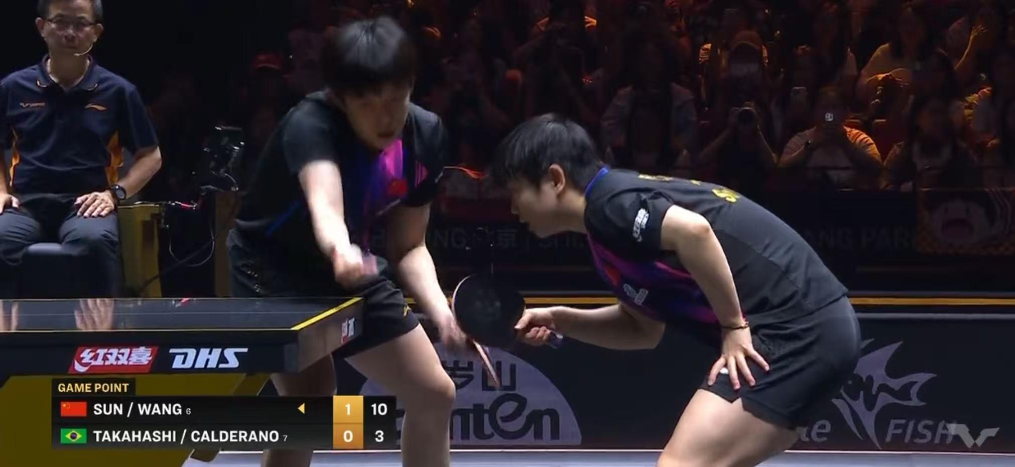 10月2日,WTT世界乒联中国大满贯在北京首钢园继续进行。在刚刚结束的一场混双半男单1/8决赛中,中国队组合王楚钦/孙颖莎以3:0战胜巴西队组合雨果·卡尔德拉诺/高桥·布鲁娜,与队友组合黄友政/陈熠会师决赛,国乒提前锁定本站比赛混双项目冠亚军。