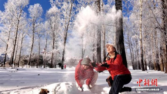 游客在呼玛一边欣赏雾凇一边玩雪。 王婷 摄