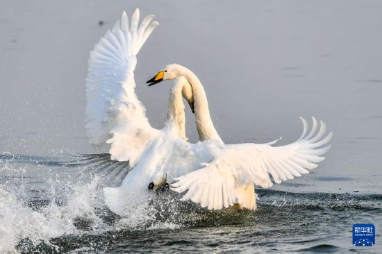 11月12日,白天鹅在山西平陆黄河湿地嬉戏。