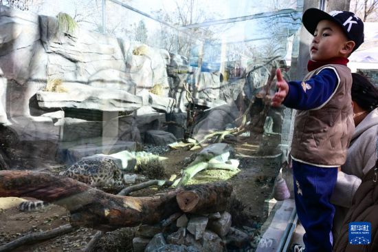 11月15日,在青海省西宁野生动物园,游客与雪豹互动。
