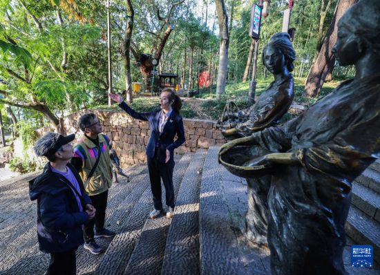 11月20日,在诸暨西施故里景区,参加今年金牌导游选拔的年轻导游(右)给游客讲述西施的故事。