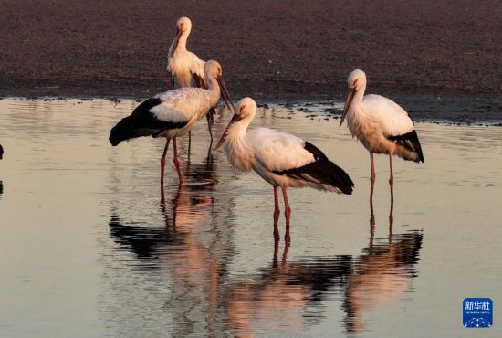 近日,大批东方白鹳飞抵河北省唐山市丰南区沿海湿地觅食、停留,形成一道靓丽的风景。
