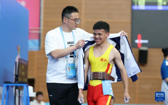 12月12日,浙江队教练在男子16-21岁组52公斤提铃比赛后为选手陈雷雷(右)披上衣服。陈雷雷获得该级别冠军。