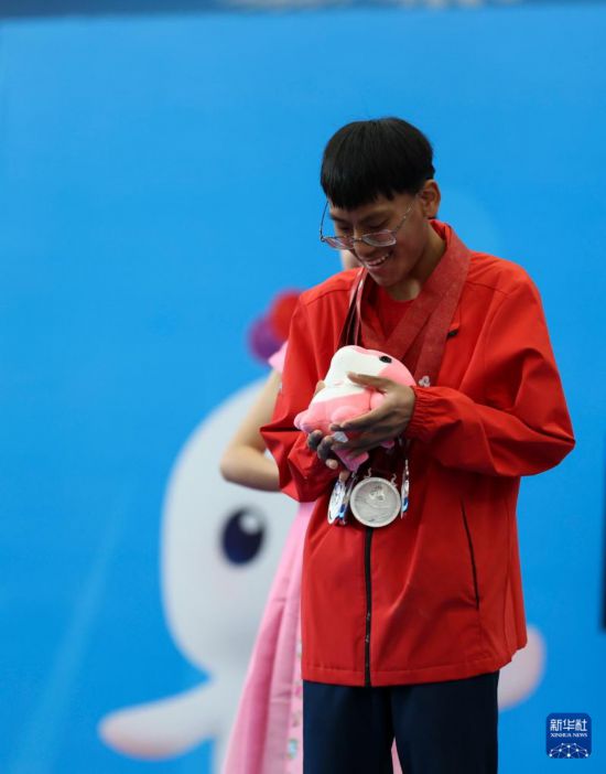 12月12日,海南队选手王广橄在颁奖仪式上手捧吉祥物。他获得男子16-21岁组56公斤深蹲比赛亚军。