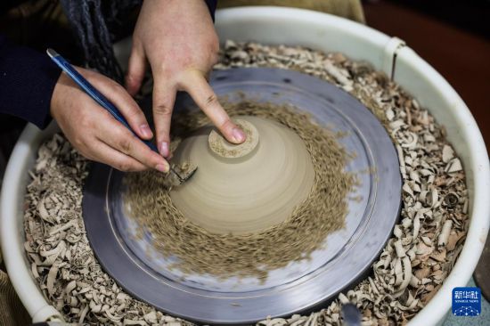 12月24日,侯梦露在位于匡堰镇倡隆村的楝树下艺术村落的东岙窑陶瓷艺术工作室内进行青瓷制作流程中的修坯。