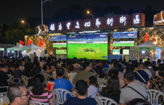 2025年10月4日,球迷在南京市建邺区银杏里文化艺术街区的“苏超”“第二现场”观赛。新华社记者 李博 摄