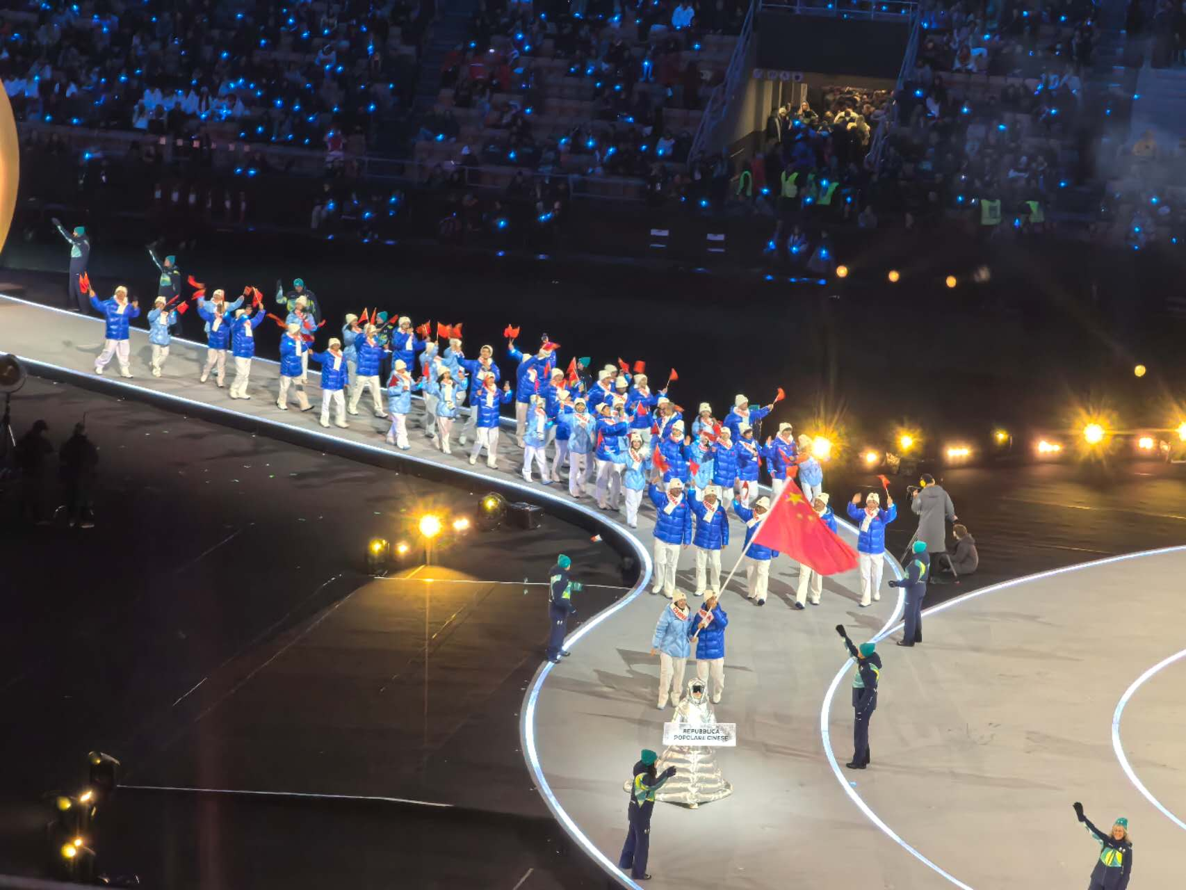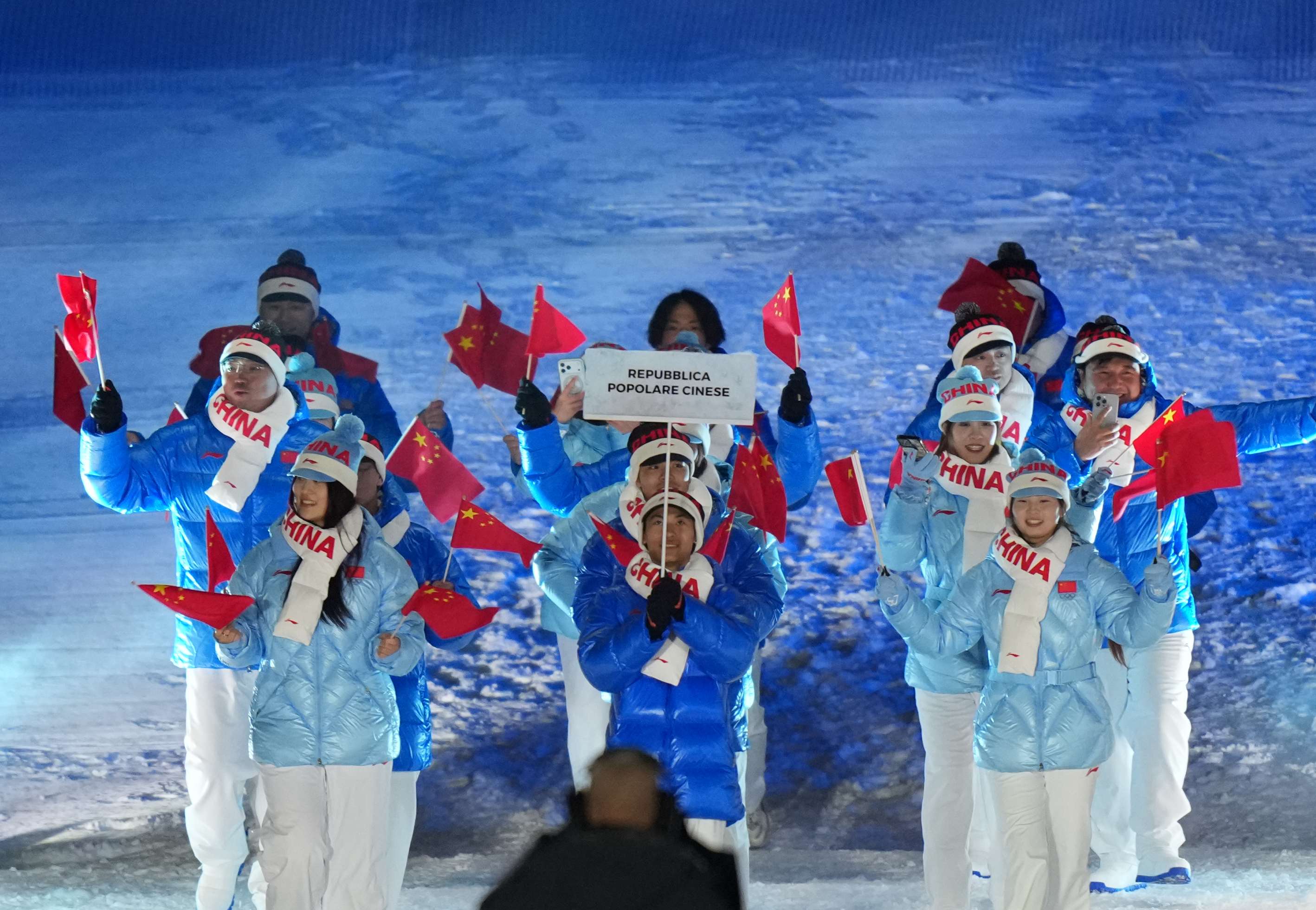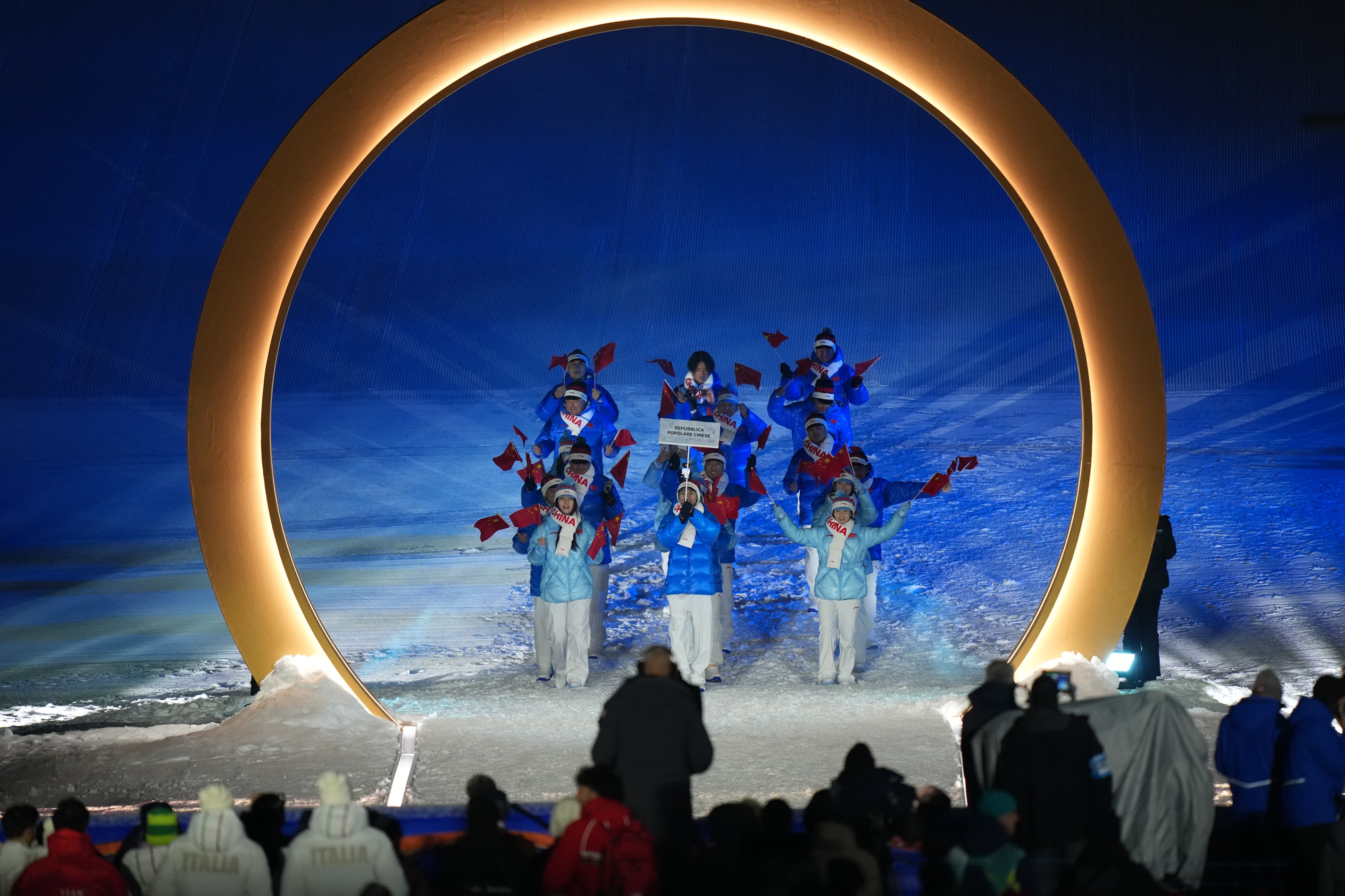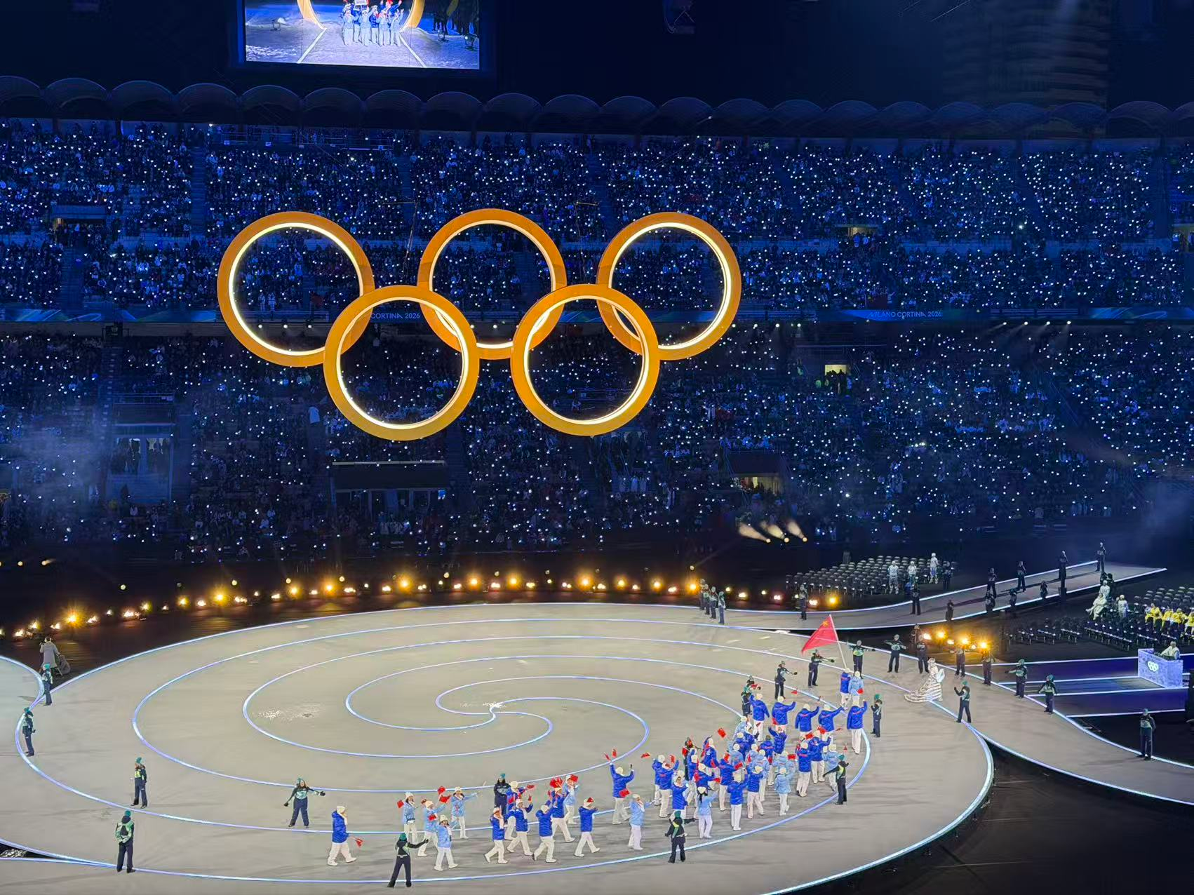 2026年米兰-科尔蒂纳冬奥会开幕式上,中国体育代表团入场,五星红旗闪耀冬奥!