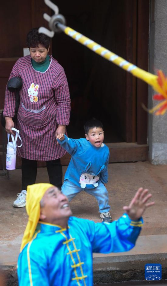 2月4日,在安华镇丰江周村的宗祠,小朋友在观看响叉排练。