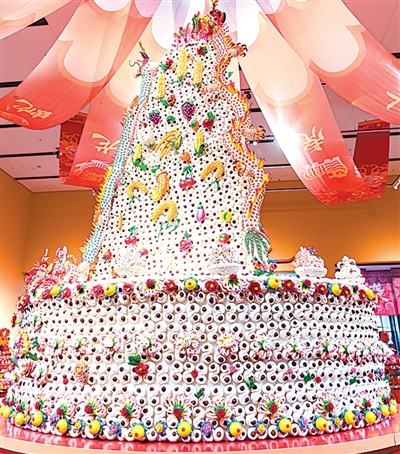 花馍既是食品又可观赏,孩子喜大人爱,受学者关注,是很有文化研究价值的活态艺术。今年,在中国工艺美术馆“过年——丙午春节主题展”中,主体陈列之一便是一个来自山西的“大鼓枣山”花馍(见图,贺佳佳摄),象征着丰收富足、吉祥美满,视觉效果震撼,成为观众主要打卡点。