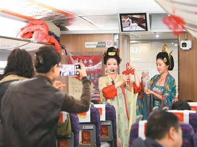 敦煌研究院、甘肃省博物馆等9家甘肃当地的国家一级博物馆,将飞天壁画、莫高窟彩塑、彩陶、简牍等陇原文化元素“搬上”这趟列车,以创新形式,搭建起流动的文化传播桥梁,让旅客在出行中触摸历史的温度,也让传统年俗在春运车厢里焕发新彩。