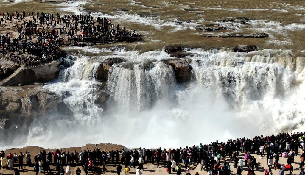 连日来,随着气温回升,位于山西吉县和陕西宜川县交界的黄河壶口瀑布段冰凌消融,瀑布落差加大,滚滚黄河水奔腾而下气势磅礴,吸引了全国各地的游客前来观赏游玩。据统计,大年初一到初三,吉县壶口瀑布景区累计接待游客超5万人次,较去年同期增长超六成。