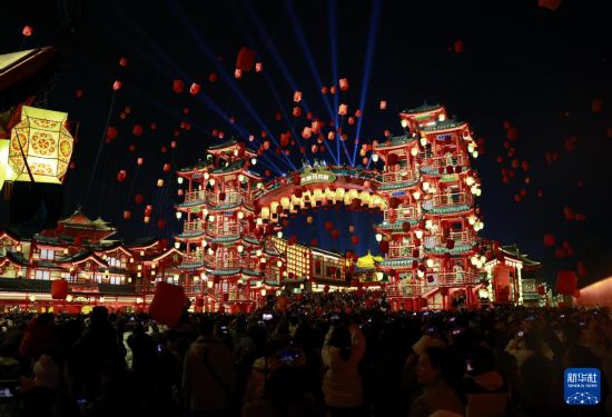 春节期间,河北省唐山市丰南区河头老街灯火璀璨、火树银花,为游客呈现出一场流光溢彩的视觉盛宴。