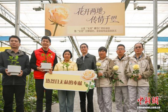 3月18日,云南省农业科学院花卉研究所向黄文秀姐姐黄爱娟(左三)、广西乐业县新化镇百坭村代表移交“文秀”月季切花及种苗。李嘉娴 摄