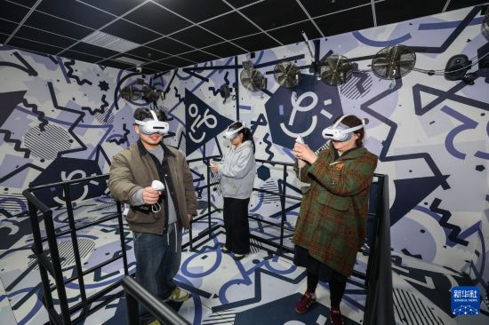 3月24日,在嘉兴市南湖区“翼时空·嘉兴1921”机遇时空体验馆内,游客佩戴VR设备在虚拟场景中互动体验。