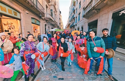 二〇二五年一月,在西班牙赫罗纳春节庆祝活动中,查磊(中间黑衣者)参与策划,并带领腰鼓方队游行及舞台表演。 |